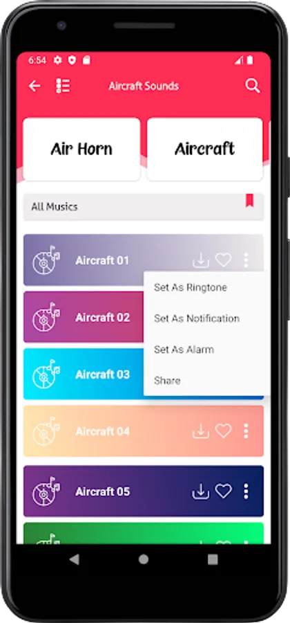 Simply press and hold on the sound you want to use as your phone's ringtone, notification tone, alarm tone, or message ringtone, then make your selection from the available options. Aircraft sounds can serve in all of these capacities.