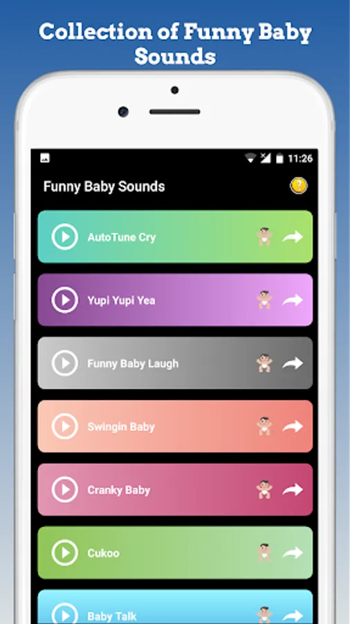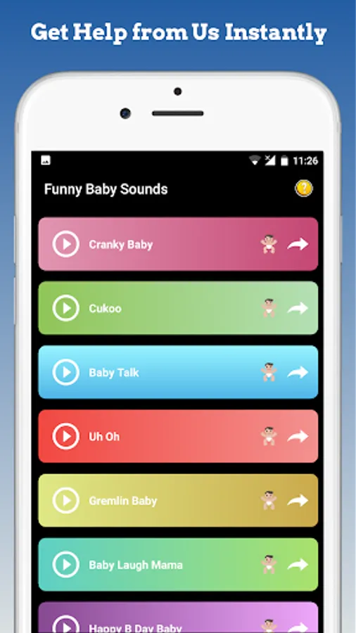Simply tap a button to listen to funny baby sound effects and ringtones. Long press to save your favorite funny baby sound.