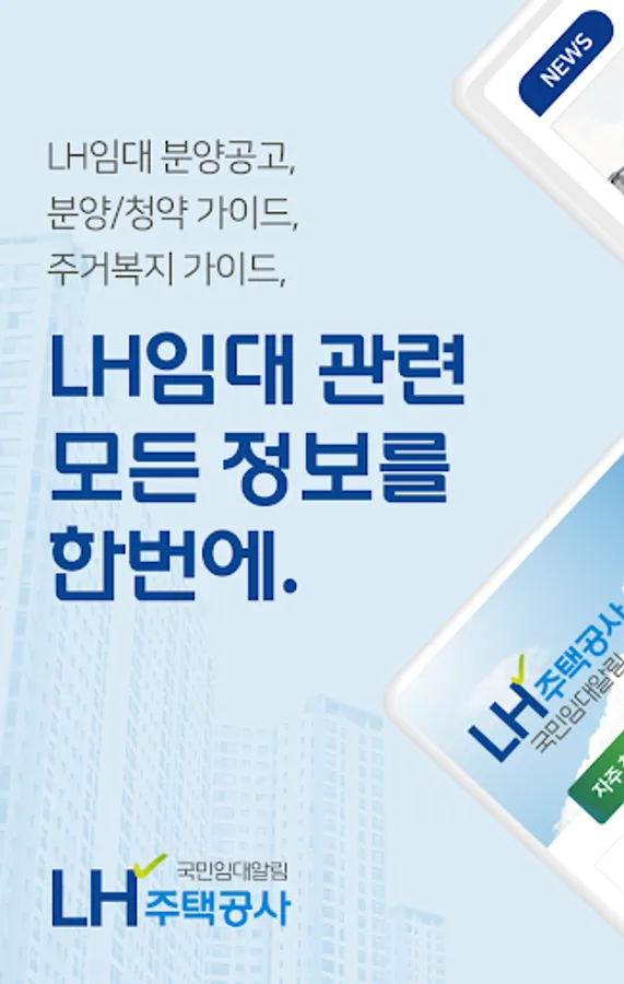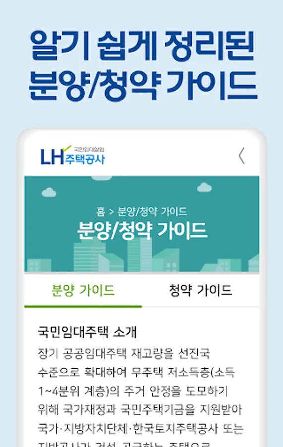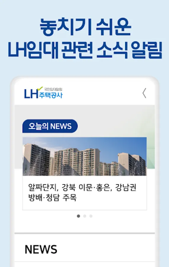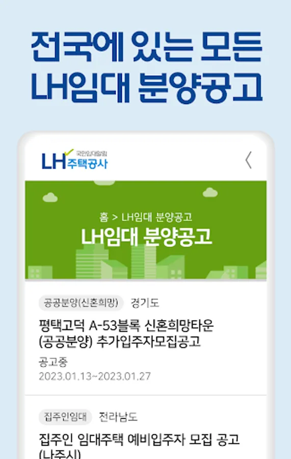 You can check the announcement news in the area you are interested in through real-time notification of local announcements, and easily find out information such as national lease, national rental apartment, permanent lease, and SH sale of LH Housing Corporation. Refer to the easy-to-see sales guide to check the sales conditions and procedures!