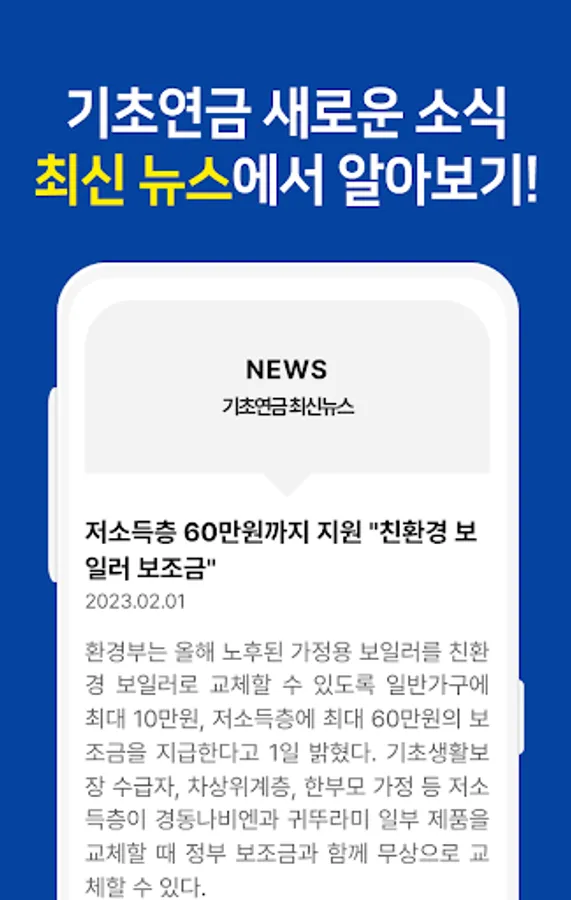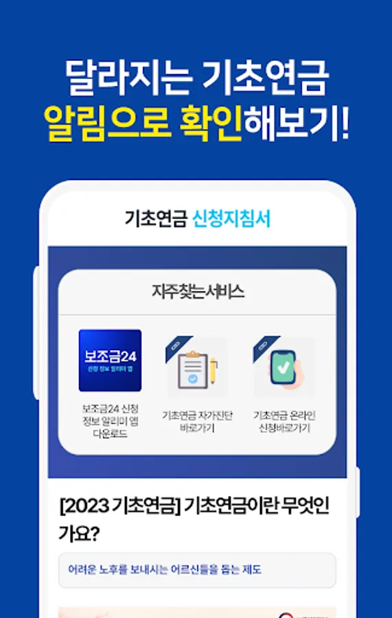 In the Basic Pension Application Guidelines app, check out everything about the 2023 change in basic pension receipt, how to apply for basic pension, application deadlines, as well as basic pension mock calculations! Push notifications provided by the app allow you to find out more quickly about new news and policies of the basic pension.