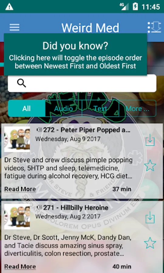 This is the most convenient way to access Weird Medicine on your phone. With this app you are always connected to the latest episodes and the show. You can also star your favorite episodes and save them to a list so you can easily enjoy them over and over! This app is complete access to Weird Medicine and if you're a fan of the show you won't want to be without it!