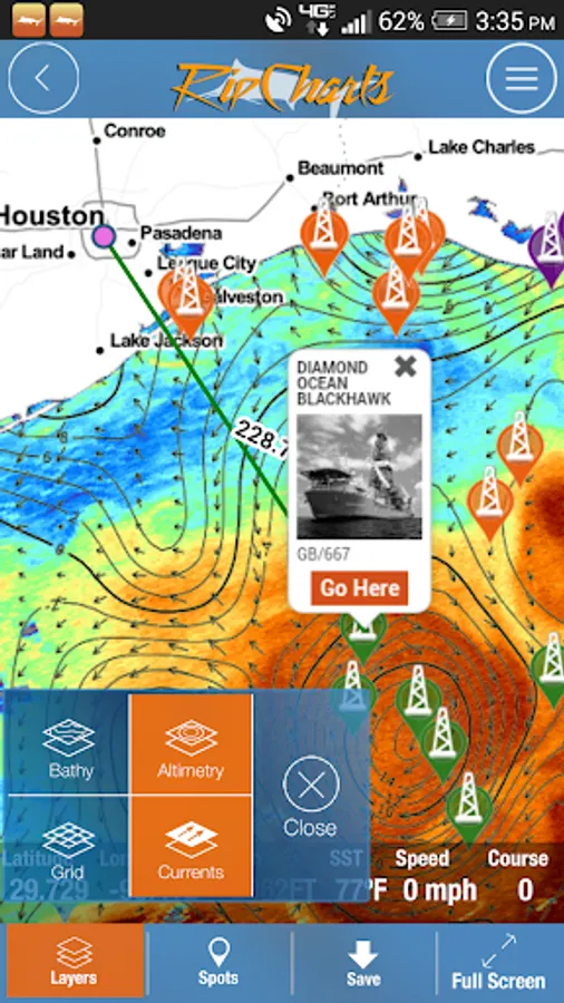 - "Go Here" navigation with bearing, ETA, and speed displays