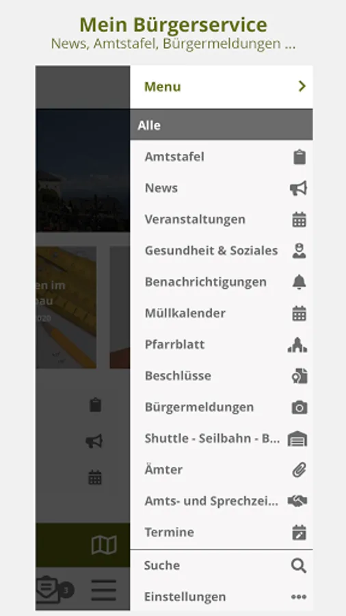 Offices, executives, community newspaper, push reports on news, push reports on events, office and office hours, resolutions, library, AZ services, photo galleries, leisure and tourism, lost property, gastronomy, fees and taxes, community facilities, health & social affairs, committees, Employees, garbage calendar, school & education, sights, retirement homes, appointments, transparent administration, accommodations, events, associations, business