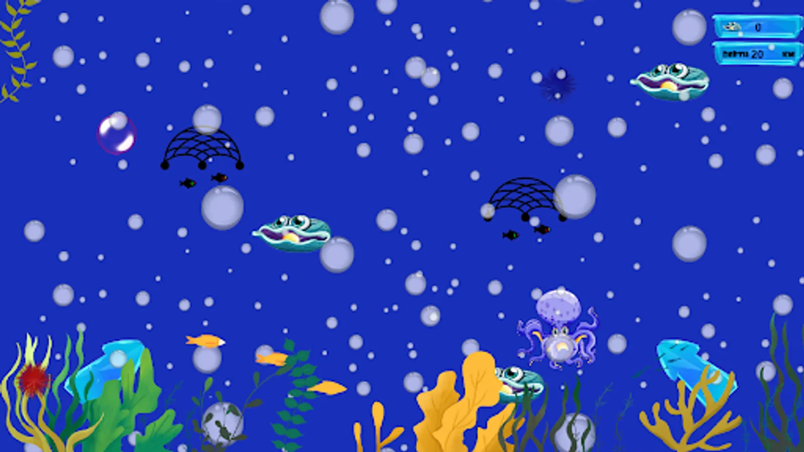 Play This cute endless game, go into deep and collect some shini pearls. Be aware of a sea animal who want to eat you. Use a fishing net to catch the octopus, crabs and evil fish.