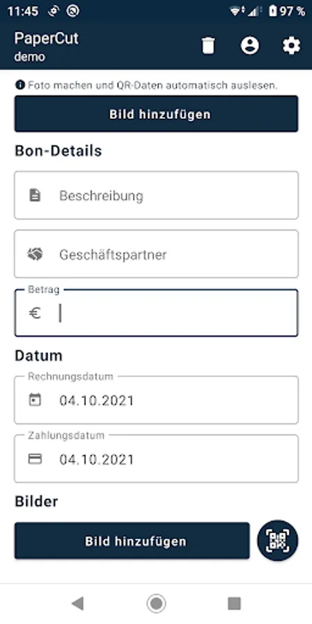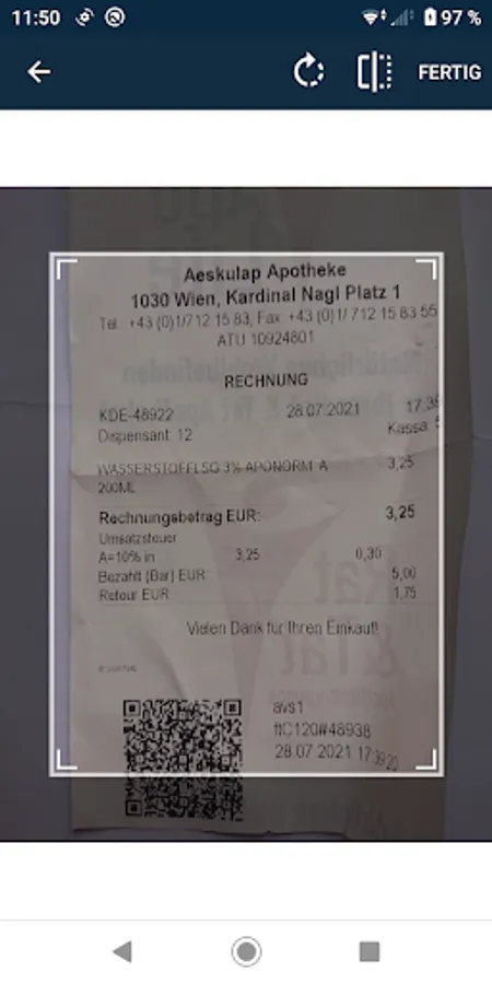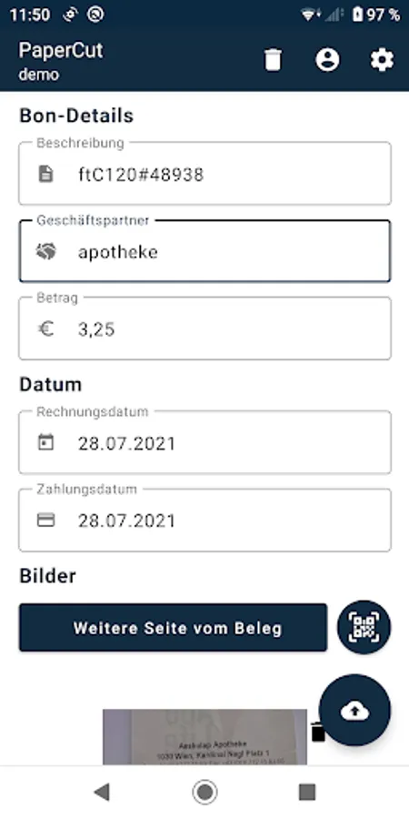 Take pictures of your bills and upload them to the accounting portal. You will never forget any of your bills for your Austrian accounting again, they get stored securely, and you account them, whenever you like. QR-Codes now get recognized automatically!