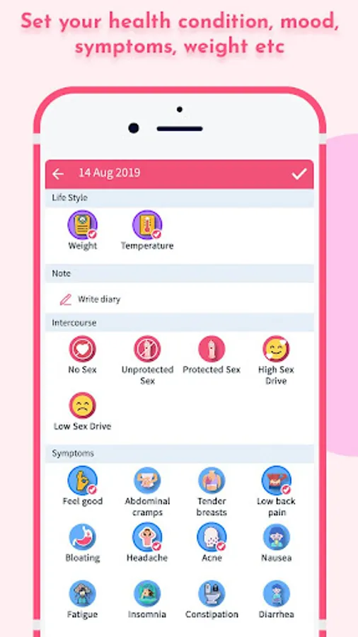 - Track your weight, temperature, mood, symptoms, intercourse, flow etc.