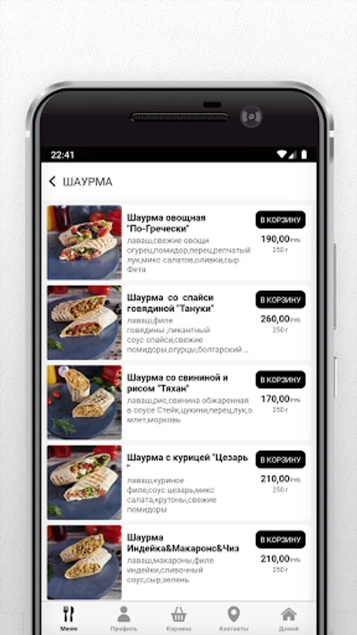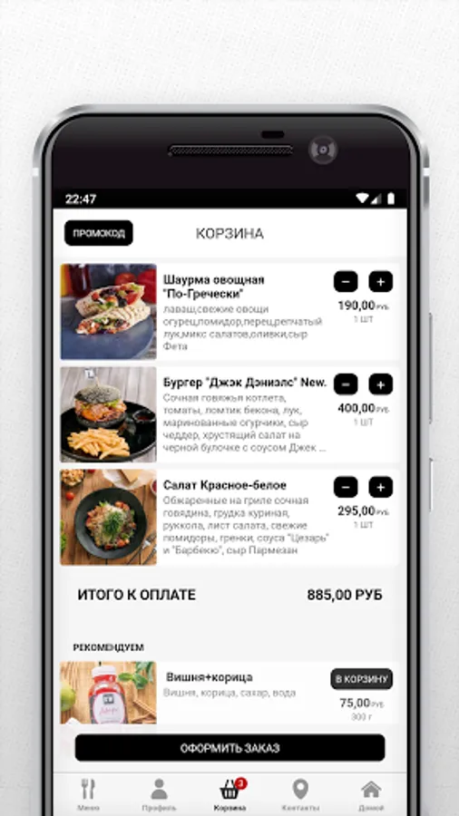 Our assortment also includes hot dishes and salads prepared by the careful and skillful hands of our chefs. And, of course, do not forget to order drinks: carbonated and still water, juices, milkshakes and fruit drinks, etc.