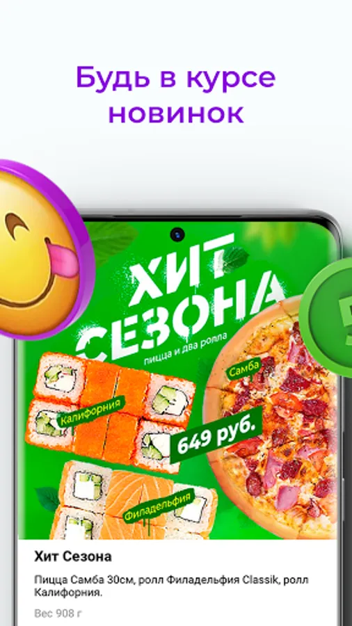 Japanese, European and American cuisines - Pizza, sushi, rolls, sets, soups, wok, salads, street food, lunches, healthy food.