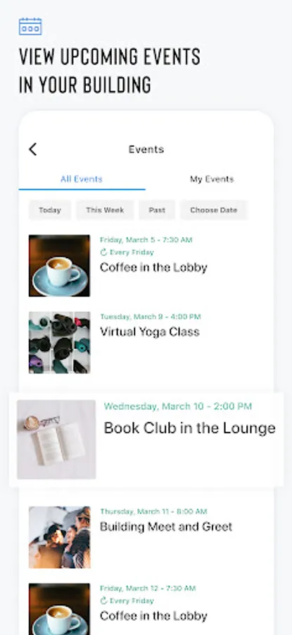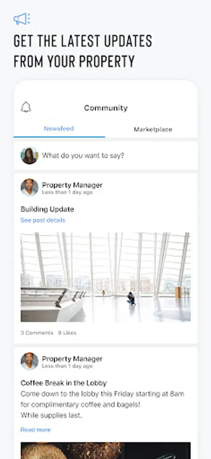 • Interact with management and fellow tenants via the news feed, message groups, events, and polls