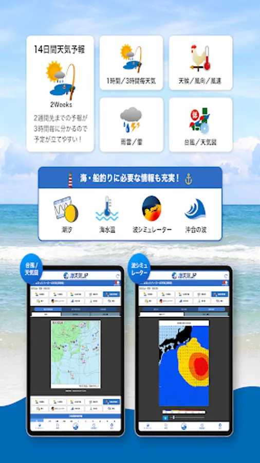 Covers information that is a must for sea fishing, such as tide data (tide graph), seawater temperature distribution map, and tidal current animation.