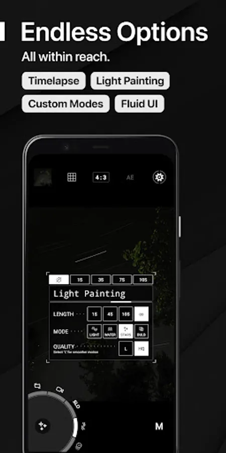 With its wide range of options, ProShot adjusts to your changing world. Fly through camera settings with its unique Dual Dial system. Record video from any mode with the press of a button. Play with light in unique Light Painting modes. Capture the stars with Bulb mode. And adjust camera output with options for Noise Reduction, Tone Mapping, Sharpness and much more.