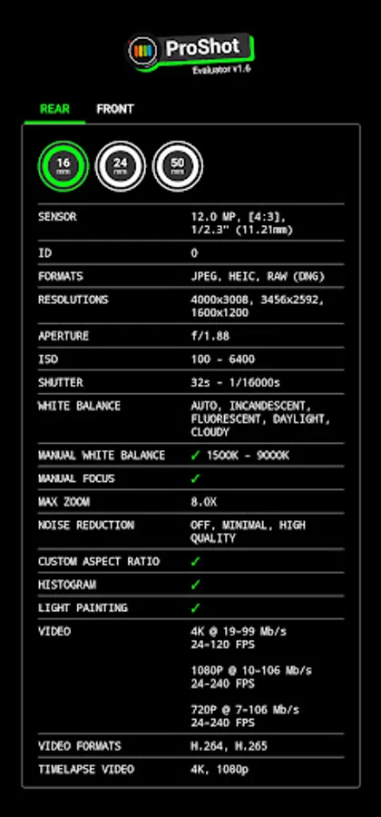 ProShot Evaluator is a free tool for evaluating the capabilities of the cameras on your device, and reports which features are supported by ProShot. This includes information about lenses, image sensor, RAW (DNG) support, manual controls (focus, ISO, shutter, white balance), video formats and more. It also includes the option to sample ProShot's UI in real-time on your device to visualize how camera settings are organized and accessed.