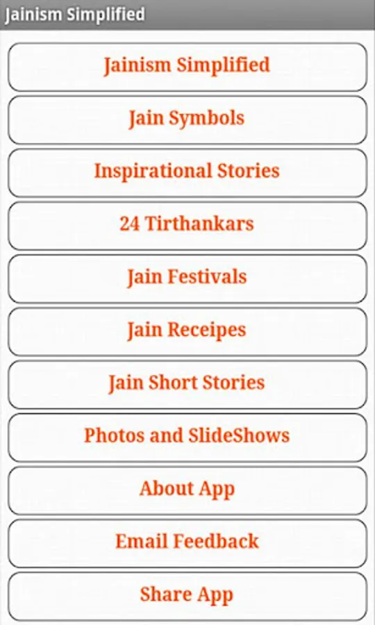 Jainism Simplified is a one stop spiritual and general content source for Jains across the Globe. This app provides information about the Jainism Principles, Inspirational Stories, Jain Recipes, festivals, Jain Symbols, Jainism Information across the globe on a single platform.It helps users to know basic principles and beliefs followed by Jain Sect, explains in detail of Navakar Mahamantra, Code of Conduct of Jainism, Tirth information directly from the app.It also brings information of key events, Jain Delicious Recipes etc., directly on your mobile. Jainism App is full of rich spiritual and humanity content.It is a great platform for Jains to interact and a must have tool on their path of spirituality