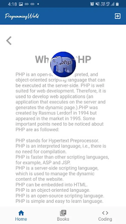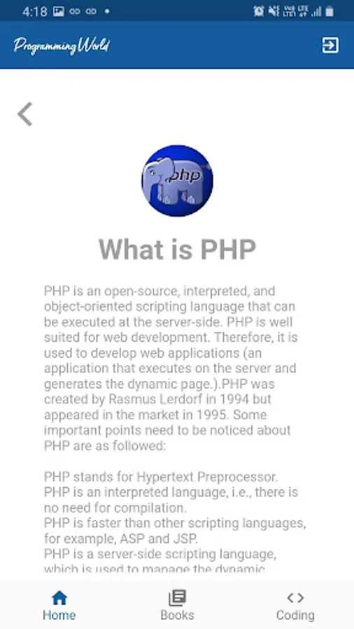 Programming World have contains many programming languages like Java, Flutter, React, PHP, JS and many more. It have a well organised coding structure which help you to learn programming languages easily.