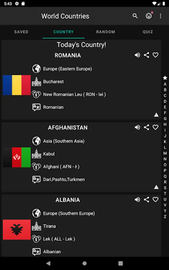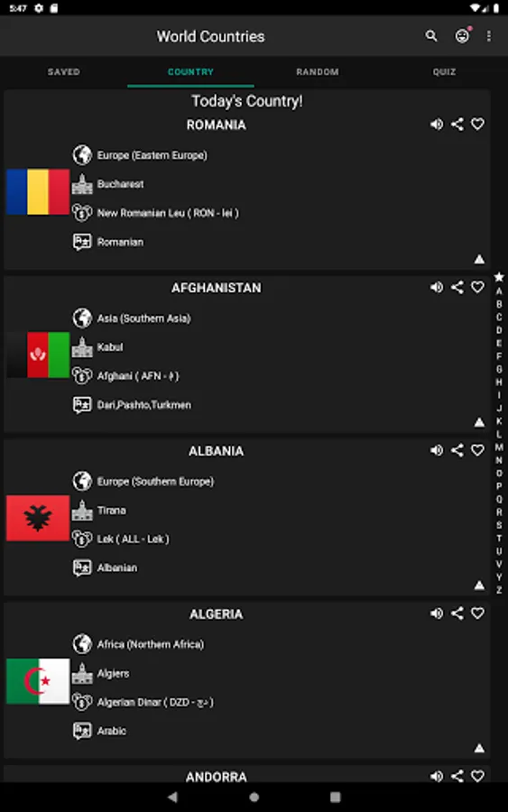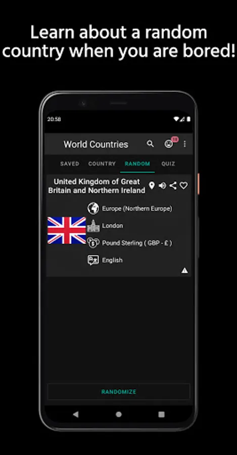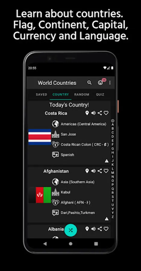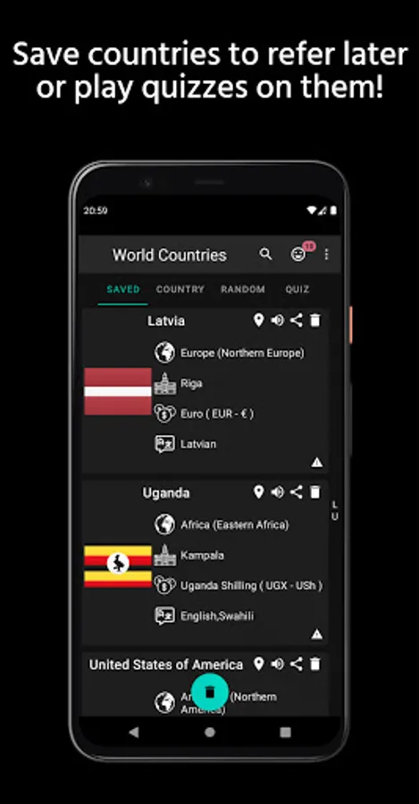 Learn about the countries. The app contains a collection and list of country names with relevant information and trivia like continent, flag, capital, currency, language and map. Also includes English pronunciation.