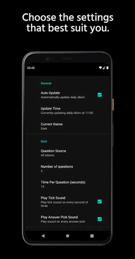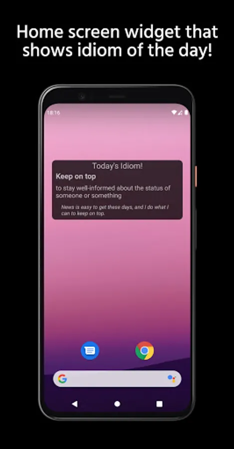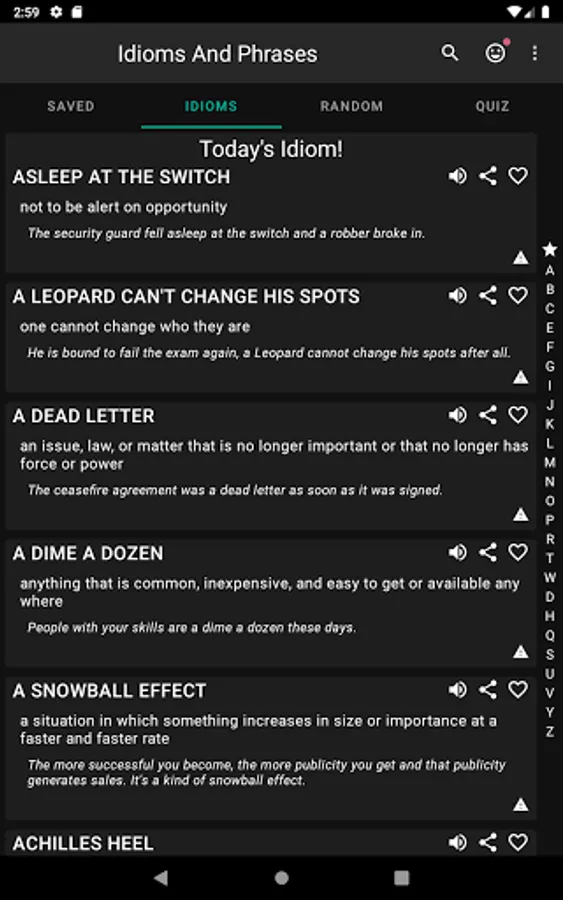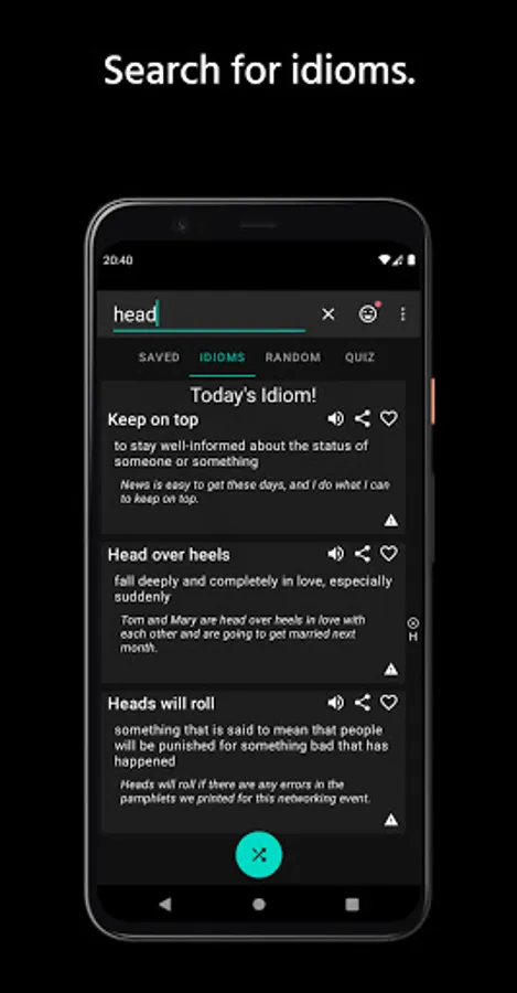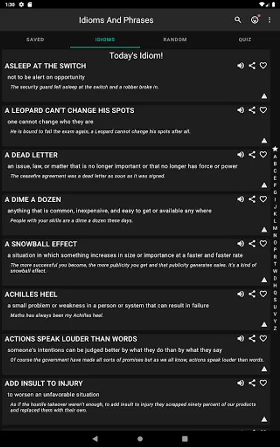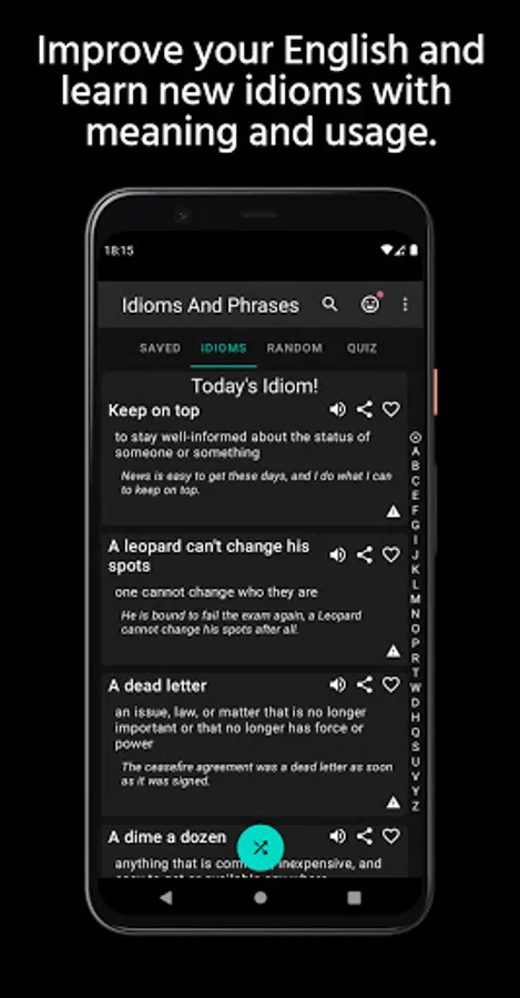 The app contains a collection of relevant, useful and popular English idioms, phrases, proverbs and phrasal verbs and other common expressions. Includes definitions, meanings, examples, usage and pronunciation in a dictionary like yet fun format.