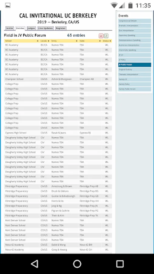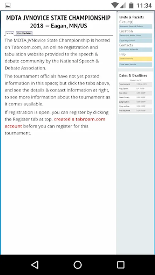 This is the first version of the NSDA Tabroom mobile app. Every tournament that is listed on Tabroom is available at your fingertips. Organized from latest to future, this app has everything from dates, locales, and links to detailed information about the tournament.