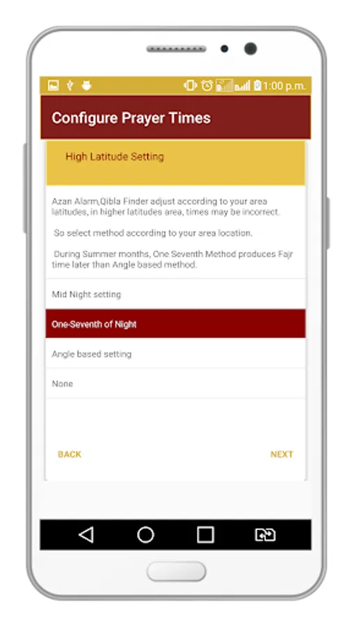 Another feature is an option of High Latitude Setting, Prayer times adjust according to your location latitude, in higher latitudes area times may be incorrect. During summer months, One seventh method produces Fajr time later than Angle based method, other option is Mid Night.