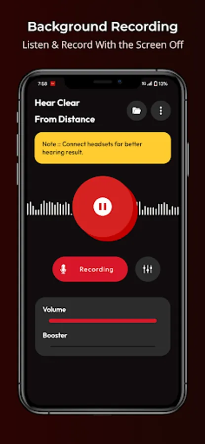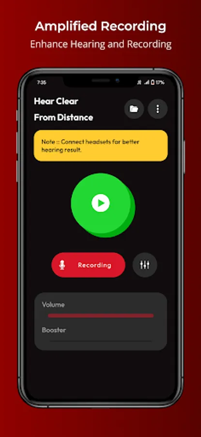Our app features a Hearing Clear screen with start/stop buttons, as well as a Recording screen with start/stop buttons. You can adjust the volume using the seekbar, or boost it even further with the Booster Seekbar. The app also includes an Equalizer Button that lets you fine-tune the audio to your preferences.