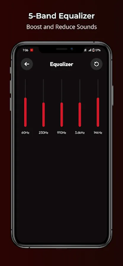 ✔️ Use the Equaliser Screen with 5 Seekbar bands with Hz to customise the sound settings.