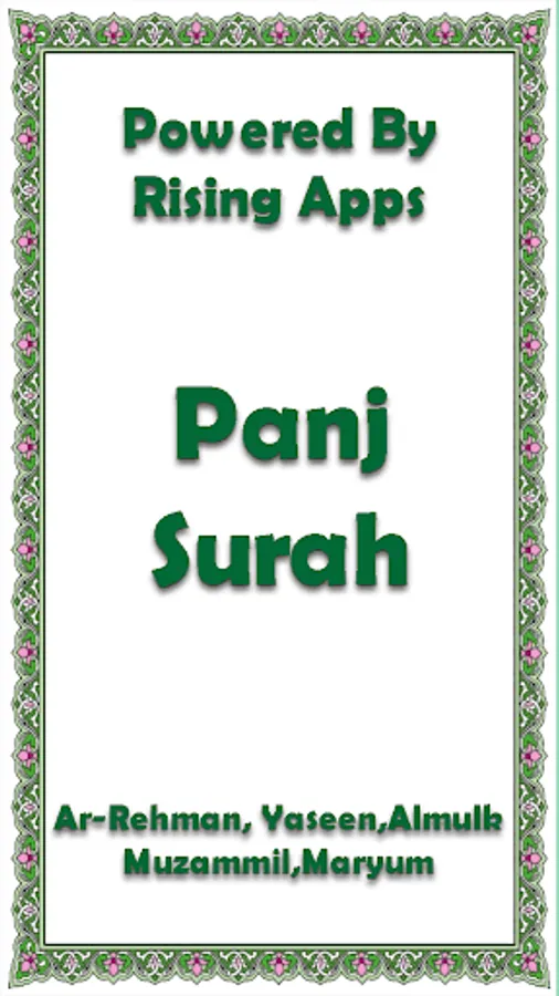 Punj Surah (Al-Quran) is a Madni Panj Surah or Panj Surta that contains mostly recited surah of Quran for easy recitation. Panj Surah app is very nice collection of Rising app, consist of 5 best and most famous surah of holy quran. panj surah app have in voice of popular qari and imam e kaaba Al shaikh Abdur Rehman Al sudais. and also very beautyfull PDF background.
