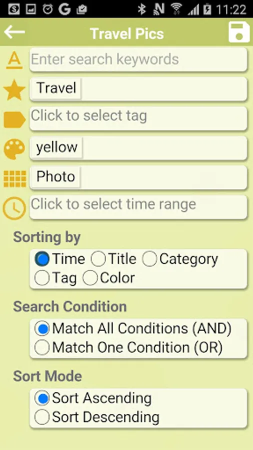 ‧Different sort modes are provided. You can set the sorting order according to time, title, category, tag, and color. Ascending or descending sorting can be set when doing an advanced search.