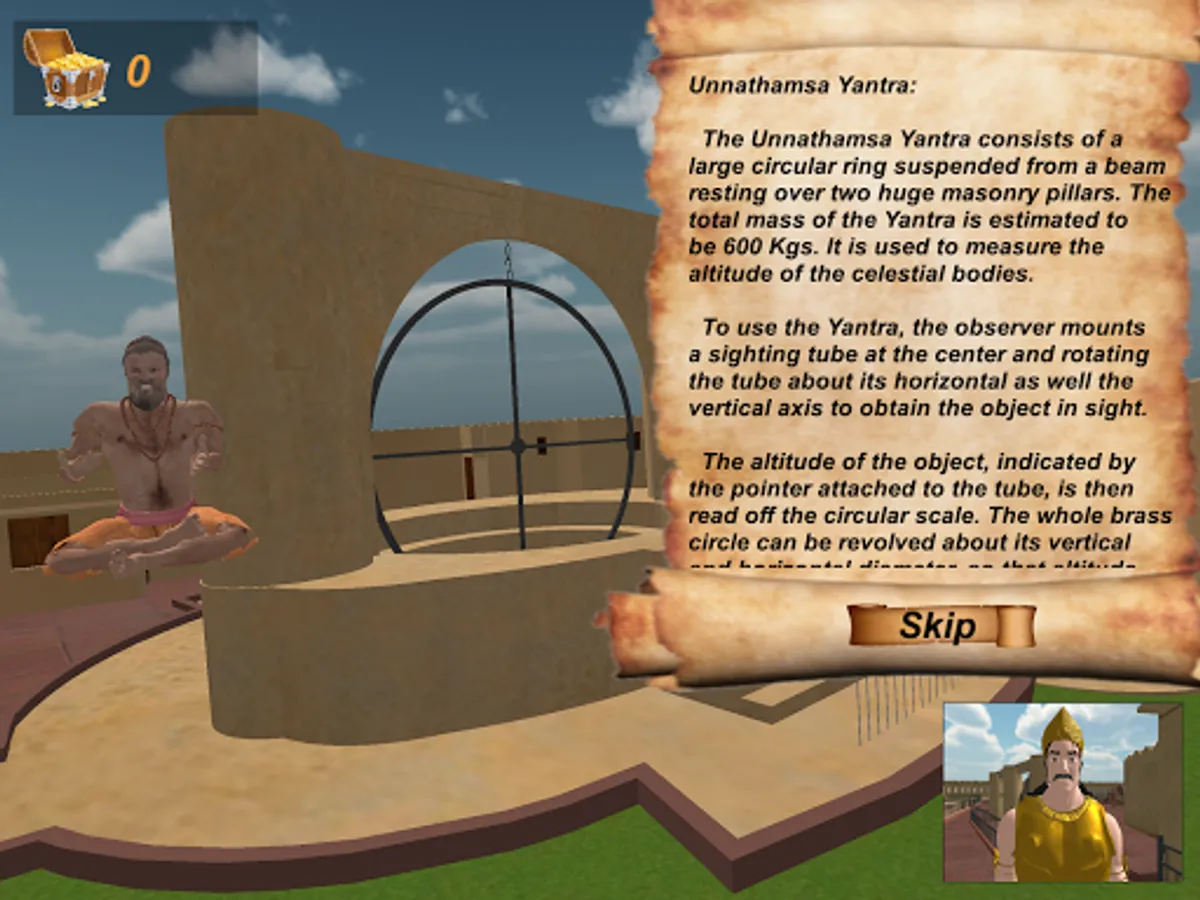 You can move using virtual joystick and visit each yantra. By tapping on a yantra a rishi will appear and narrate you history.