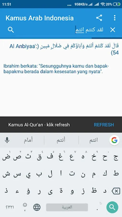 4. Untuk android versi 3 kebawah atau android yang belum support bahasa Arab, silahkan menginstall aplikasi arabic keyboard (kami rekomendasikan menginstall "anysoftkeyboard" + update pack arabic language-nya) terlebih dahulu untuk transliterasi kata Arab - Indonesia.