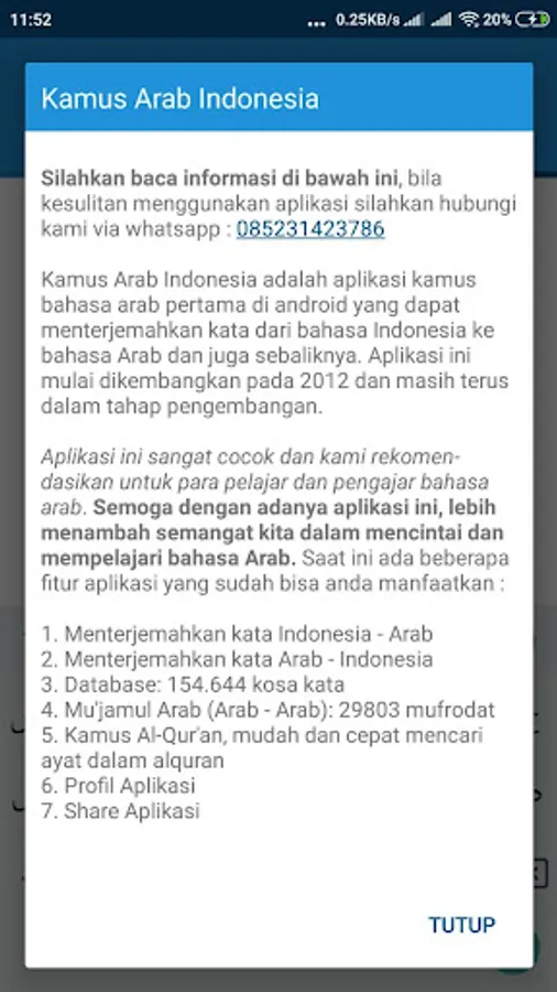 3. Aplikasi kamus ini hanya menterjemahkan per kata. Jika menulis kalimat akan diterjemahkan perkata kecuali pada kamus Al-Qur'an sesuai potongan kata/kalimat dari ayat Al-Qur'an.