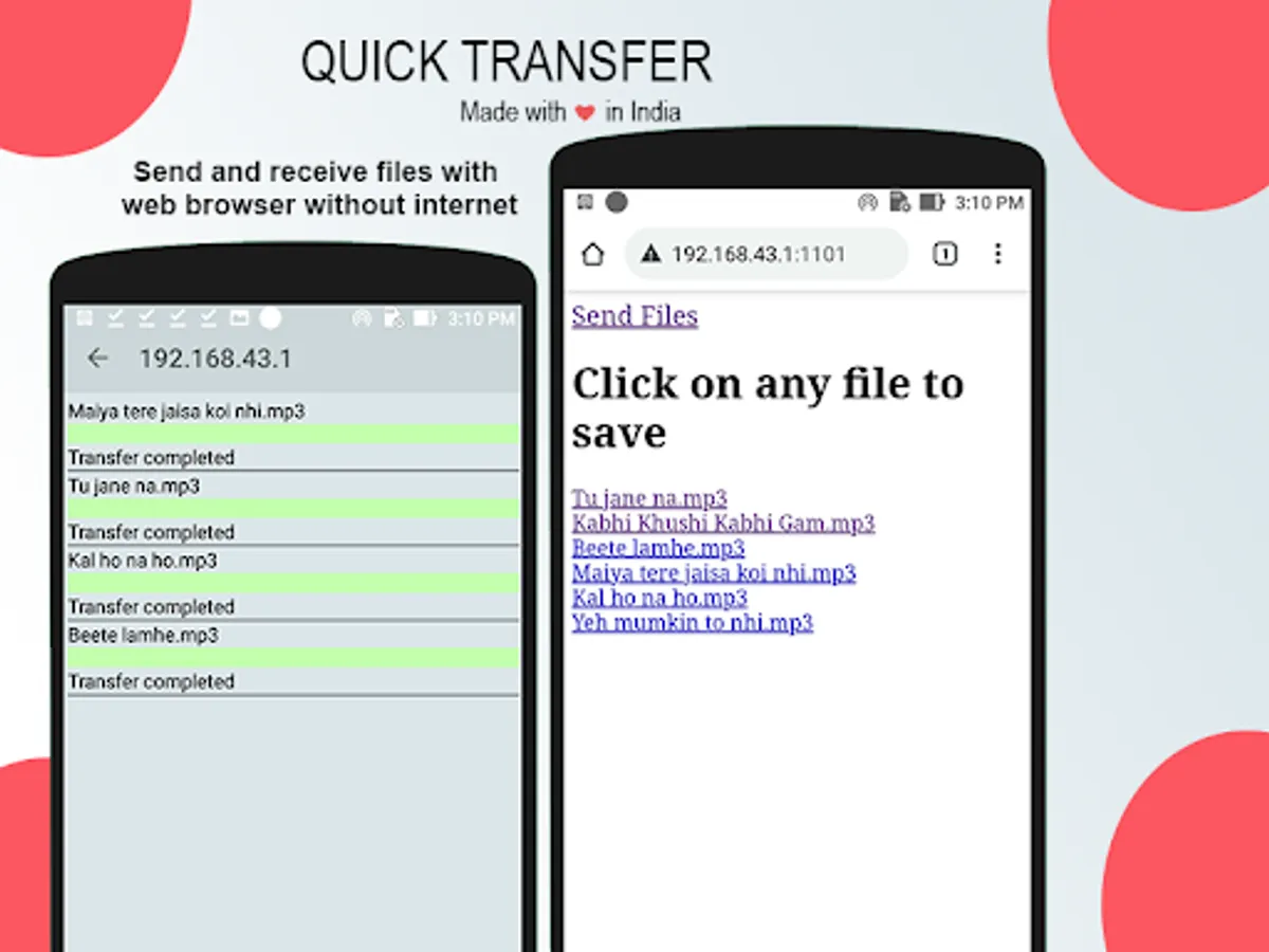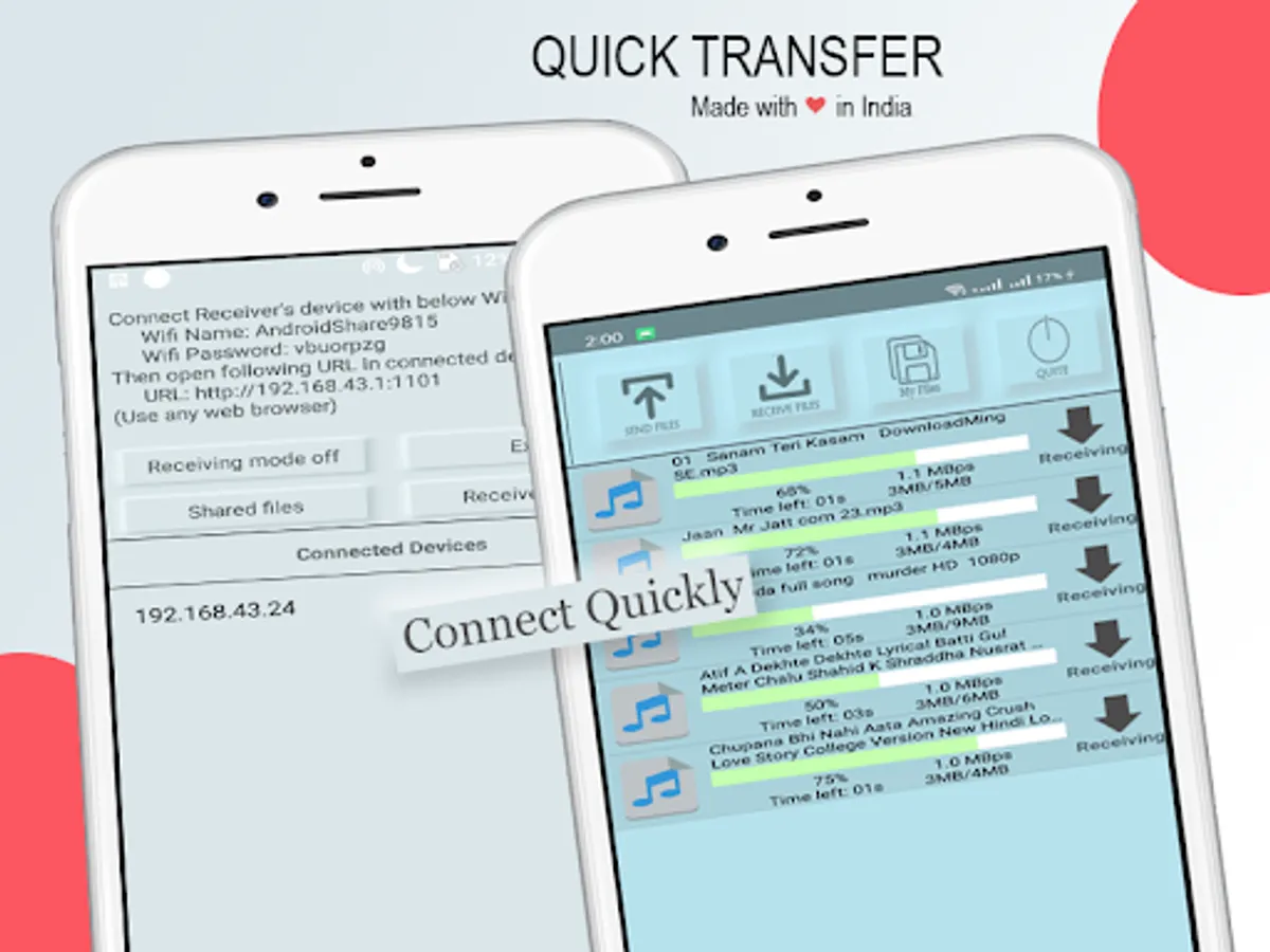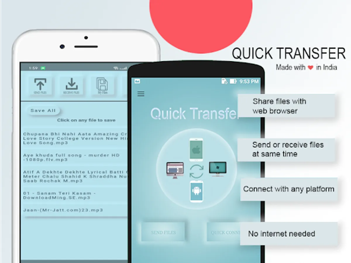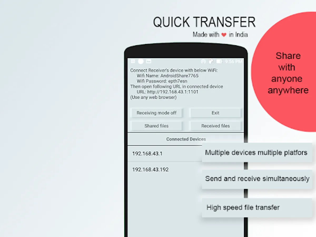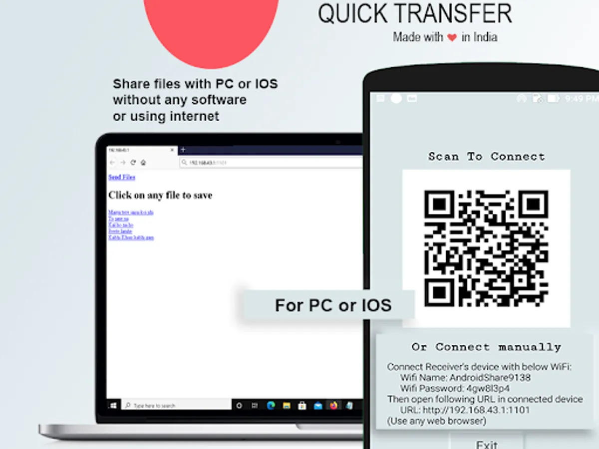 Need to share files but have no Internet connection? No problem! Quick Transfer allows you to share files with multiple devices (Windows Mac IOS, etc.) at same time without using internet or installing any other software/app.