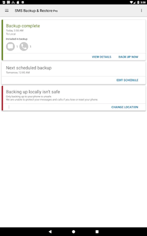 SMS Backup & Restore Pro is an app that backs up (creates a copy of) SMS & MMS messages and call logs currently available on the phone. It can also restore messages and call logs from already existing backups. This is a Paid no-ads version of the ad-supported free app.