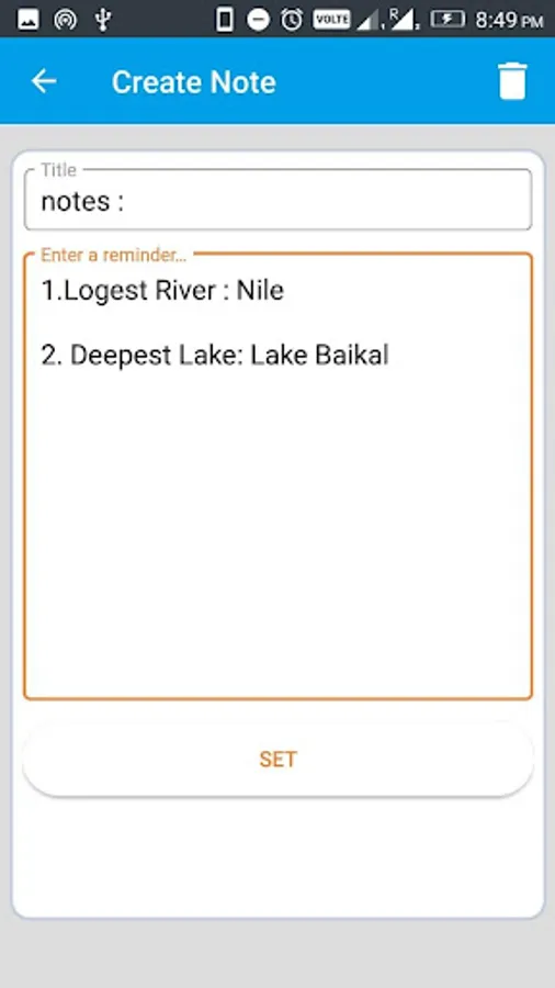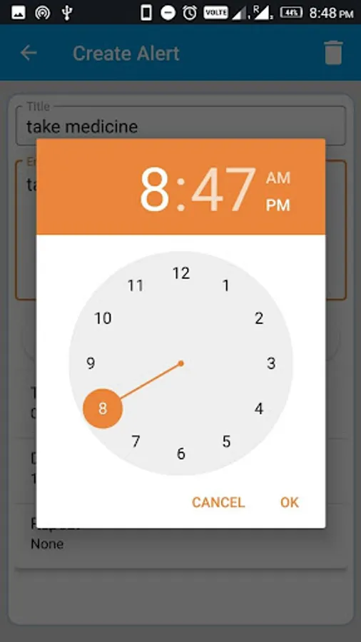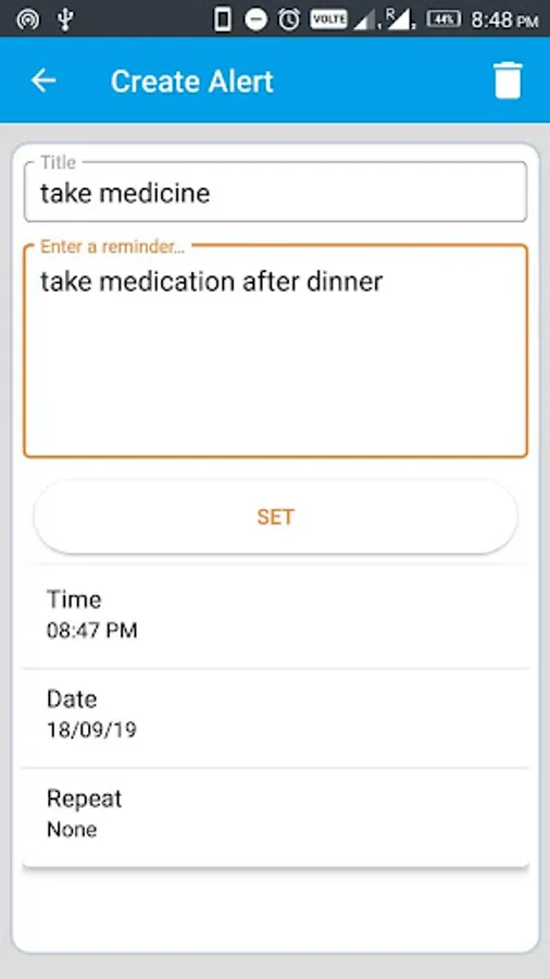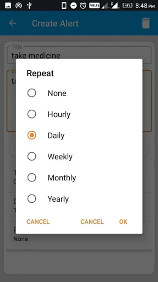 - Reminder in a customised way with repeat options minute, hour, daily, weekly, monthly, weekdays, yearly.