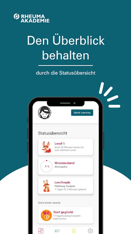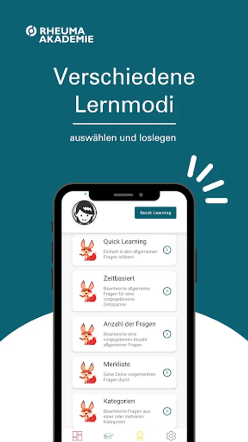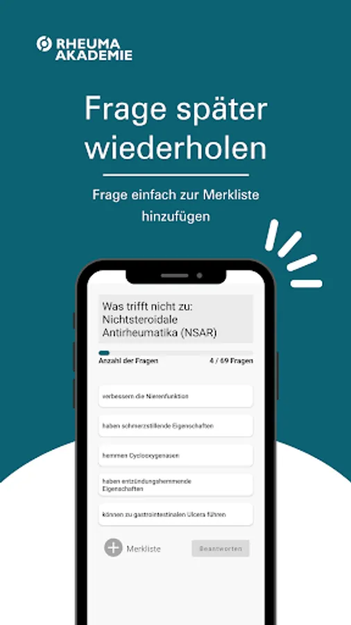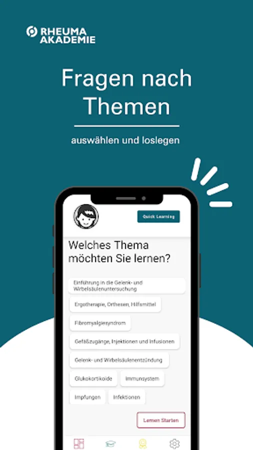 The app supplements the courses at the Rheumatology Academy. In the app you will currently find catalogs of questions for the further training of rheumatological specialist assistants as well as a catalog of questions for medical students.