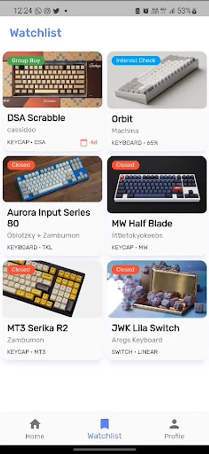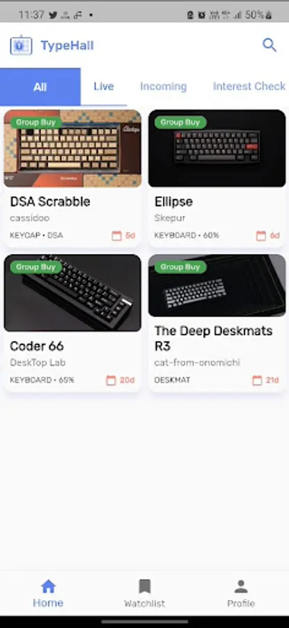 • Product listing by status (Group Buy, Incoming Group Buy, Interest Check, Closed)