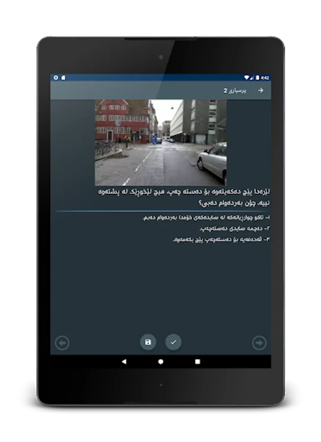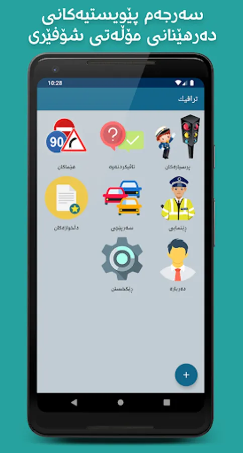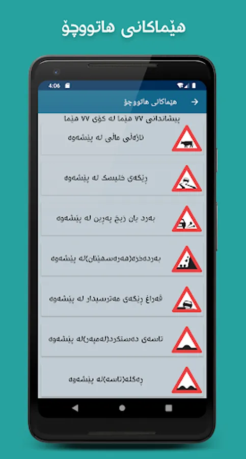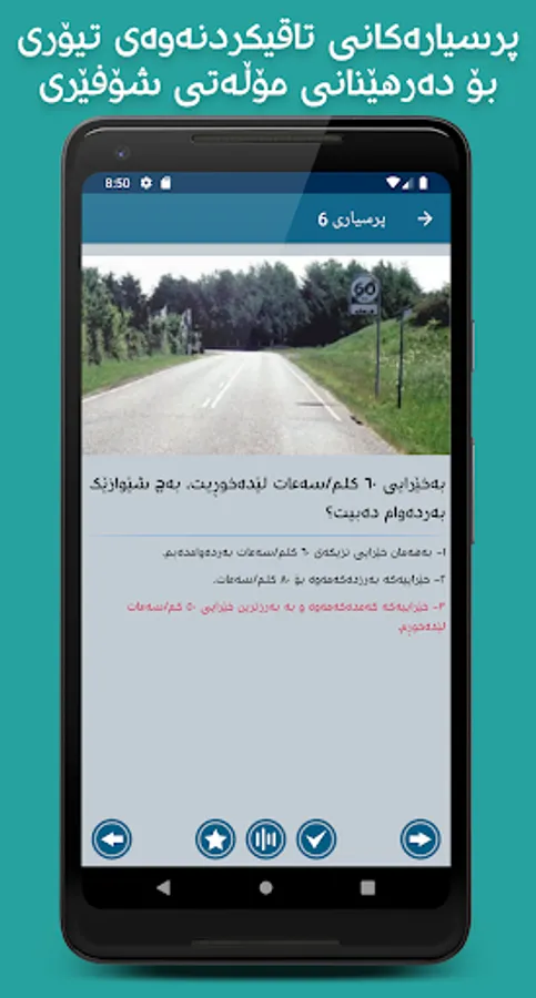 ئەم بەرنامەیە ٦٠٠ پرسیاری تیۆری هاتووچۆ لەخۆدەگرێت، کە هاوڵاتیان تاقیکردنەوە ئەنجامدەدەن لەو پرسیارانەدا بۆ وەرگرتنی مۆڵەتی شۆفێری، لەڕێگەی ئەم بەرنامەیەوە زۆر بە ئاسانی دەتوانیت پرسیارەکان ببینیت، لەگەڵ چەندین زانیاری و هێمای هاتووچۆ، هەروەها بەرنامەکە بە ٣ ڕەنگ و دۆخی تاریکەوە بەردەستە تاوەکو بەکارهێنەر بێزار نەبێت لە خوێندنەوەی پرسیارەکان.