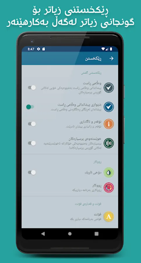 * بوونی ڕێکخستن بۆ گونجاندنی زیاتر بەرنامەکە لەگەڵ بەکارهێنەردا.