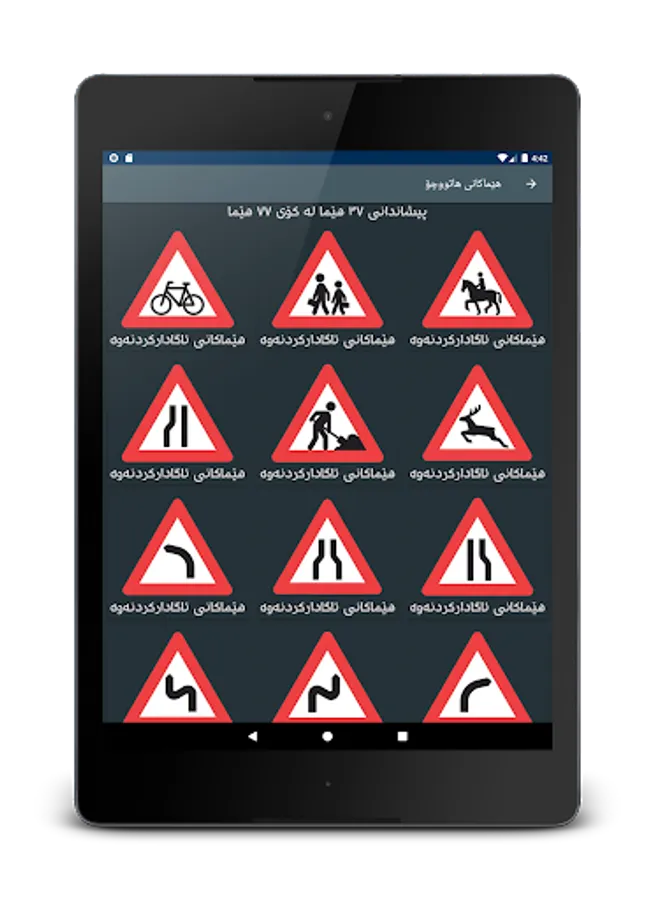 - هێماکان: چەندین هێمای هاتووچۆی تێدایە کە پێویستە شۆفێر واتاکانی بیزانێت.