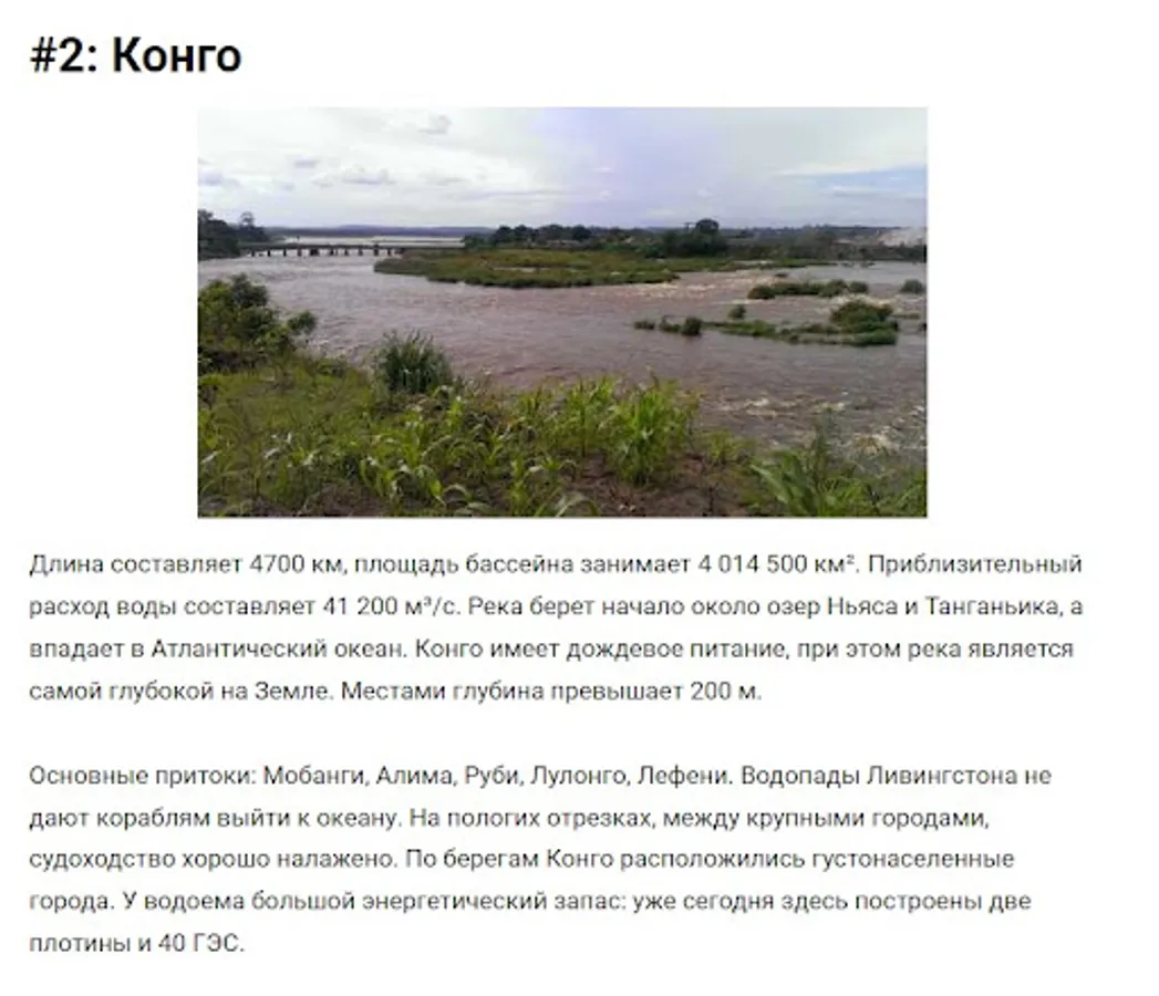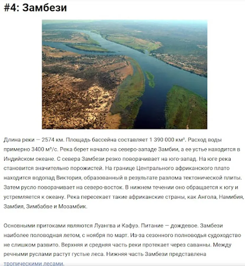 Реки Африки. Среди Африканских рек, в Атлантический океан впадают реки: Конго (Заир) - самая полноводная и вторая по длине река Африки, Нигер, Сенегал, Гамбия и Оранжевая. В Средиземное море - Нил (самая длинная река в Африке). Сток в Индийский океан осуществляется главным образом рекой Замбези.