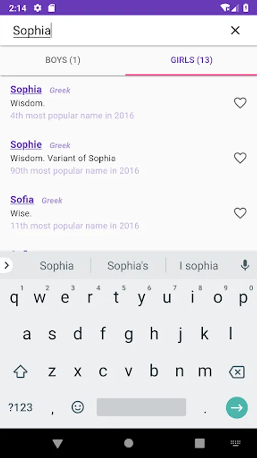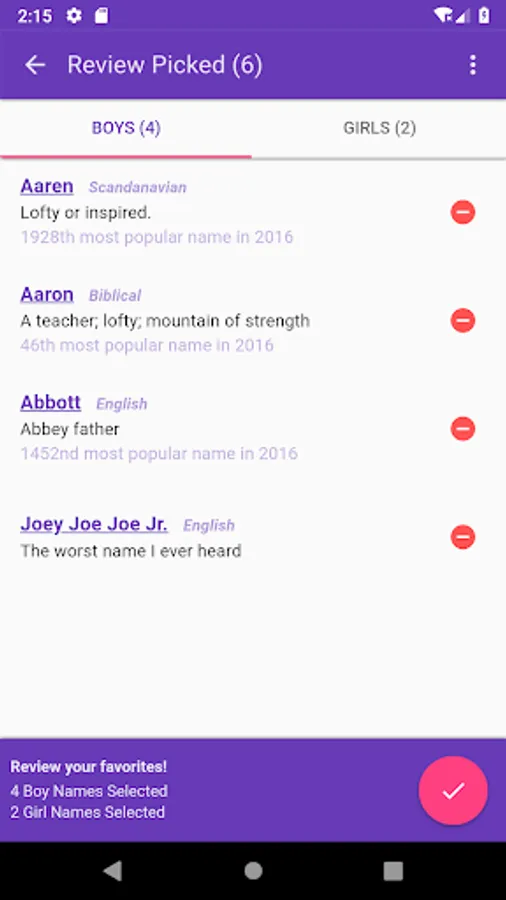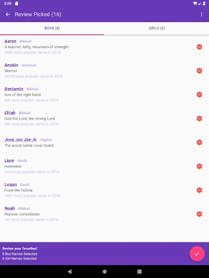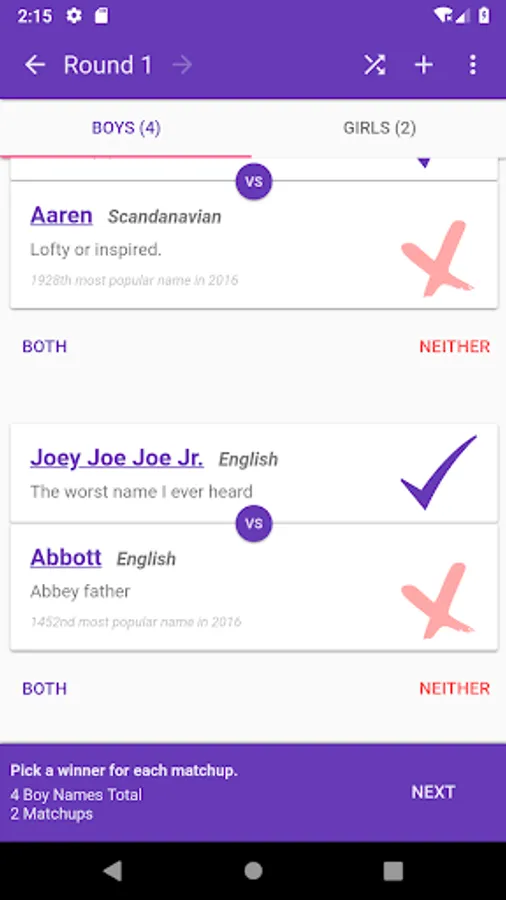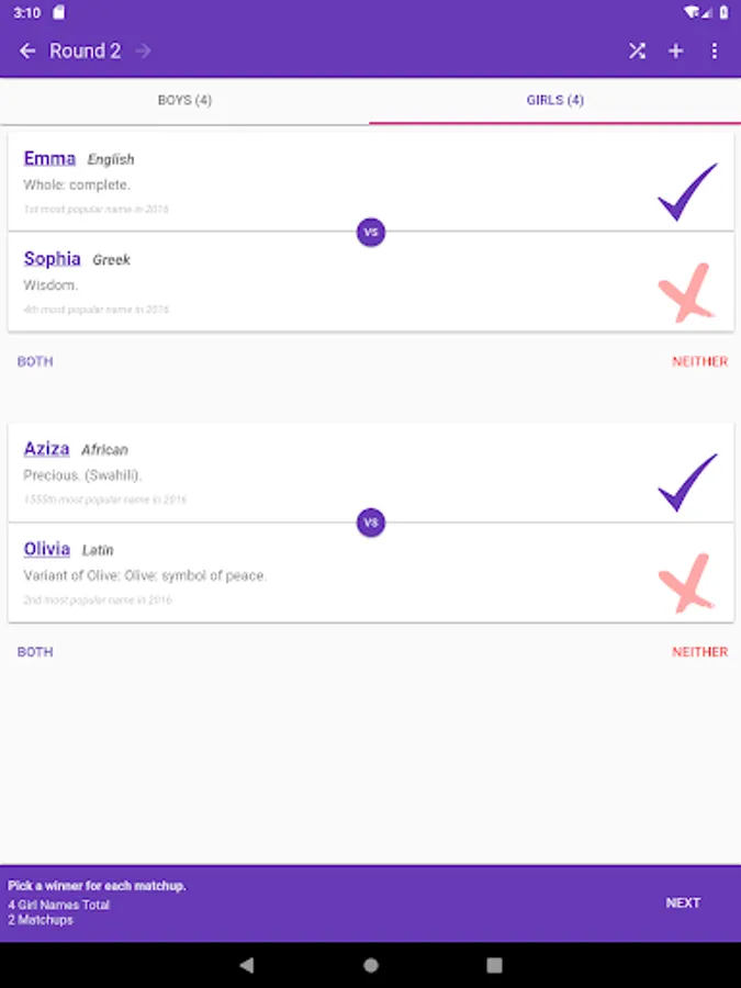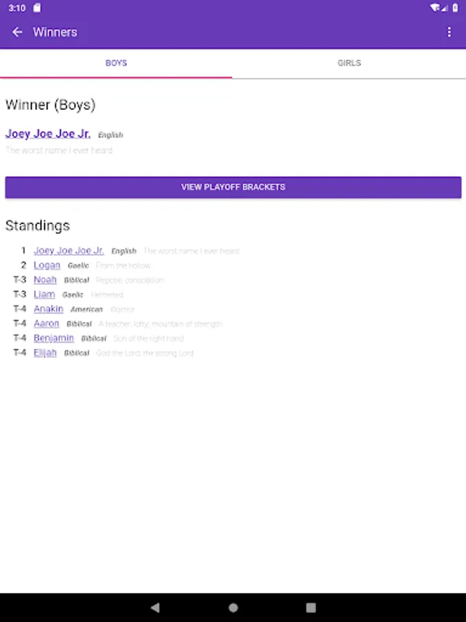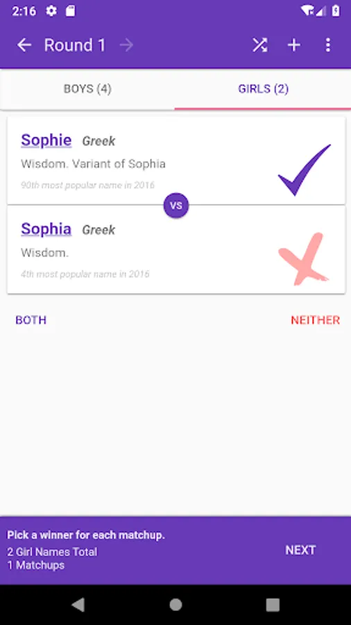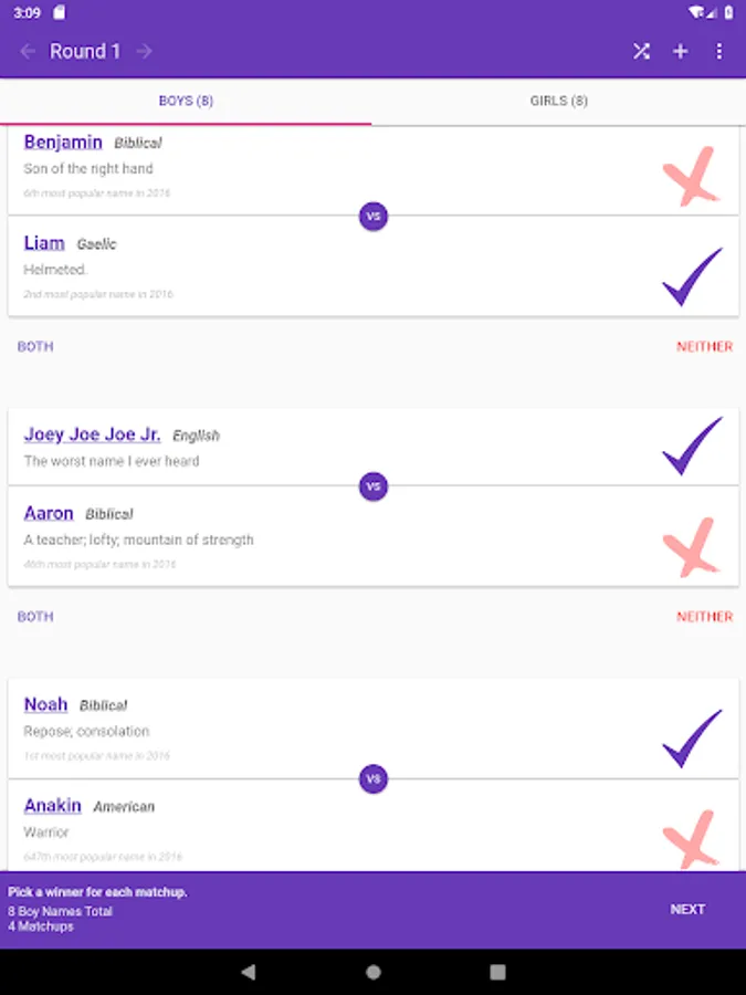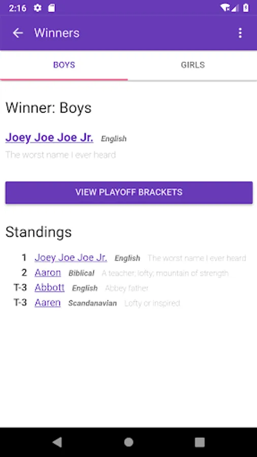 Baby Name Playoffs lets you choose and add custom names. Pick all your favorite baby names and them have them fight to the death! Only one name will be the champion!