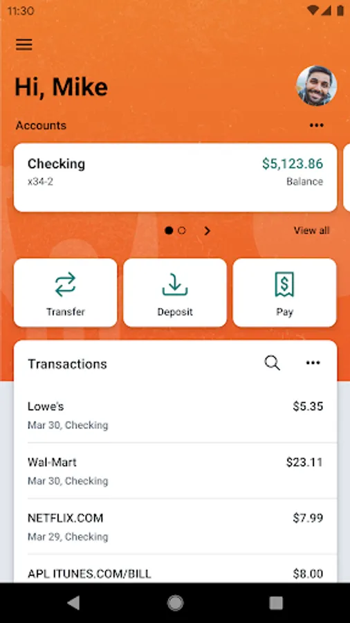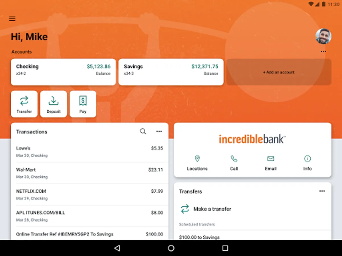 Account management: See account balances, transfer money between your Incredible Bank accounts and view your transaction history.
