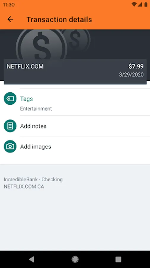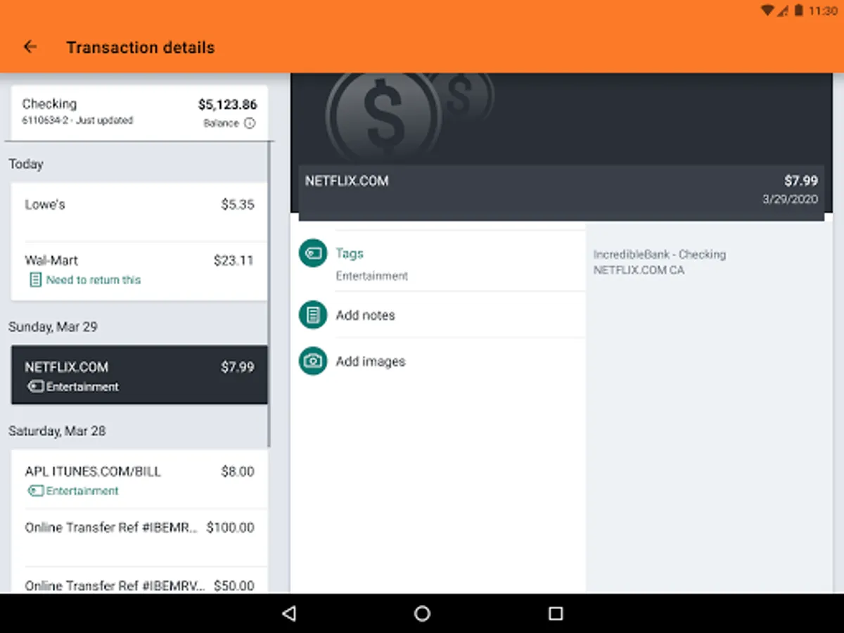 Multi-account view: See all of your financial information (balances, transaction history, merchant spending averages) from your other financial institutions in the Incredible Bank app for on-the-go organization.