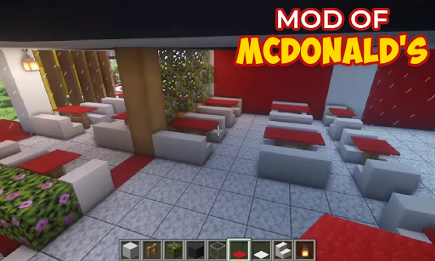 There is one unique game feature linked with this map in Minecraft: Fast Food Restaurant. You can not only eat burgers and pizza here, but you can also design any atmosphere and run the restaurant!