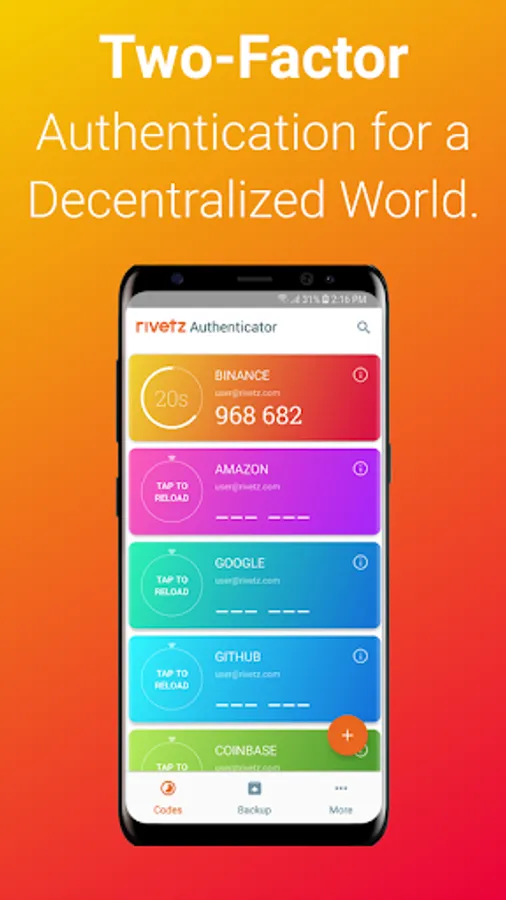 Rivetz Authenticator creates Two-Factor Authentication codes for your important accounts and backs them up so you won’t get locked out. All your favorite services – Gmail, Coinbase, Facebook, Binance, Twitter, work accounts – are more secure with hardware-based 2FA.