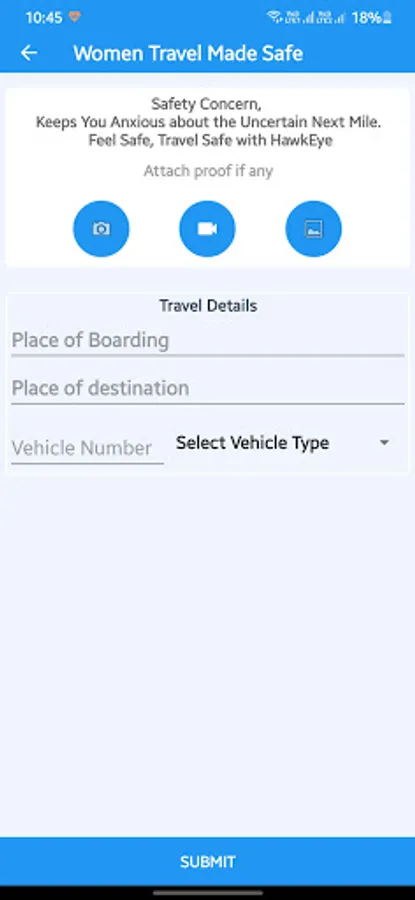 A Major area of concern is woman's safety during travel, especially for working women. This Feature helps in ensuring woman's safety while on travel. Whenever a woman board any type of conveyance viz., Taxi, Cab, Auto, Bus, train or any other vehicle, just click the photograph or video of vehicle before boarding, note down vehicle no., place of boarding and send it online to police. Even during the travel, if any problem is faced, the same can be sent. After reaching destination, they can send the comments about the happenings during the travel.
