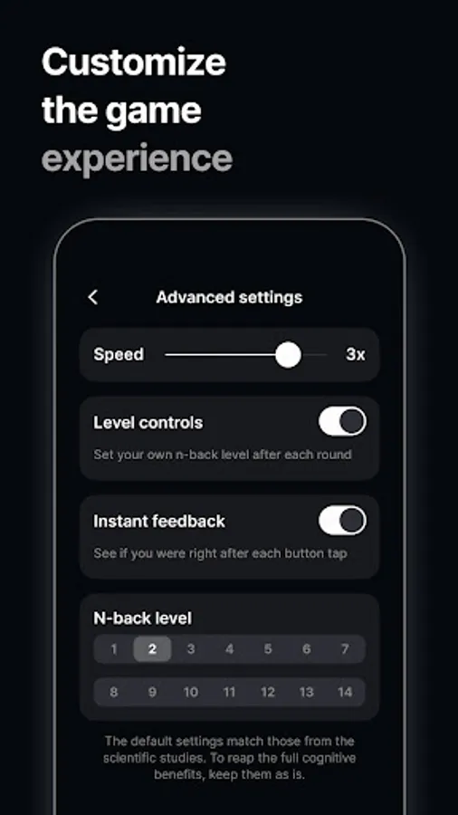 CUSTOMIZE YOUR EXPERIENCE: The N-Back Challenge allows you to choose between different voices across multiple languages, turn on notifications, and customize their timing and style. There are advanced settings for turning on instant button feedback, controlling the n-back level, and tweaking the game speed. And if you are too busy to complete one session every day, you may switch to the Weekly Habit, which gives you a full week to complete each session.