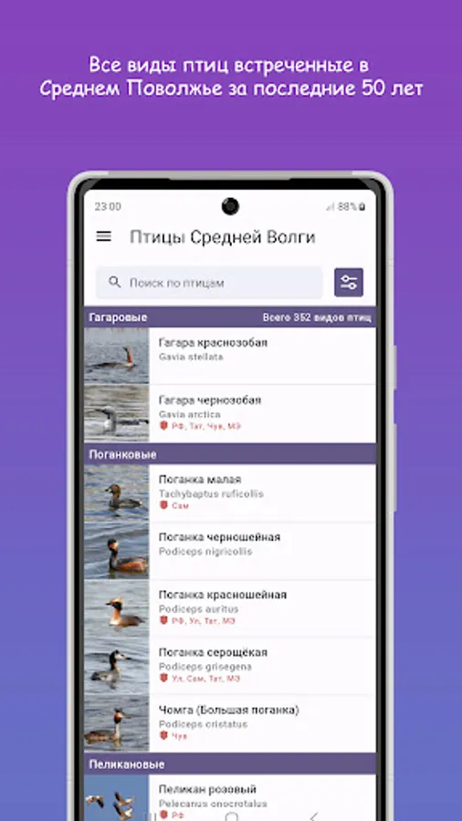 The application is the first of its kind guide to all bird species encountered over the past 50 years in the Middle Volga region, and this is more than 350 species!