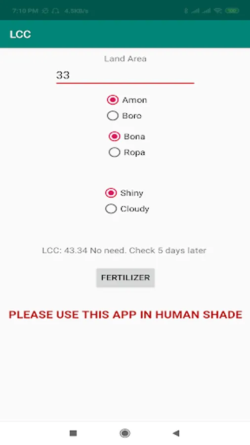 Leaf Color Chart (LCC) is used in agriculture modeling for monitoring the plant performance by comparing the leaf color and its corresponding color in LCC. To digitize the acquisition and interpretation of leaf color, a smartphone camera is used. Color calibration is necessary for a smartphone before capturing and interpreting leaf color. The calibration process evaluates the camera performance with the operational lighting conditions and determines whether the smartphone camera can be used for leaf color interpretation or not. The result from camera color calibration is used as a relative color chart for interpreting leaf color. The farmer can use the app offline or online. The farmer takes a picture by using a smartphone, the smartphone will process the image. The app will ask the user for field area farmer then put the total area of paddy field than the app will show the amount of fertilizer need for the field. For segmentation farmer will keep the leaf on hand no white paper is needed.