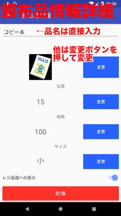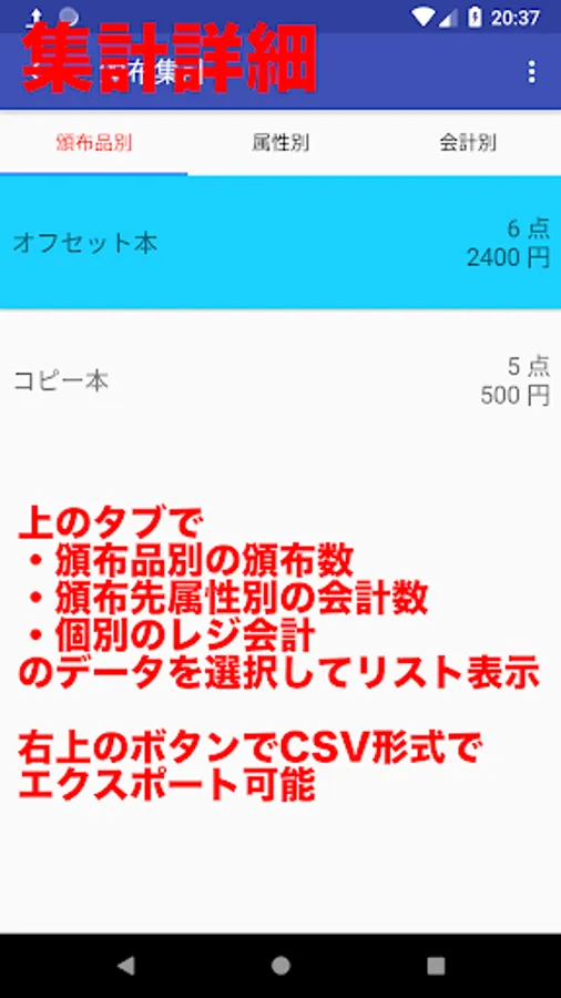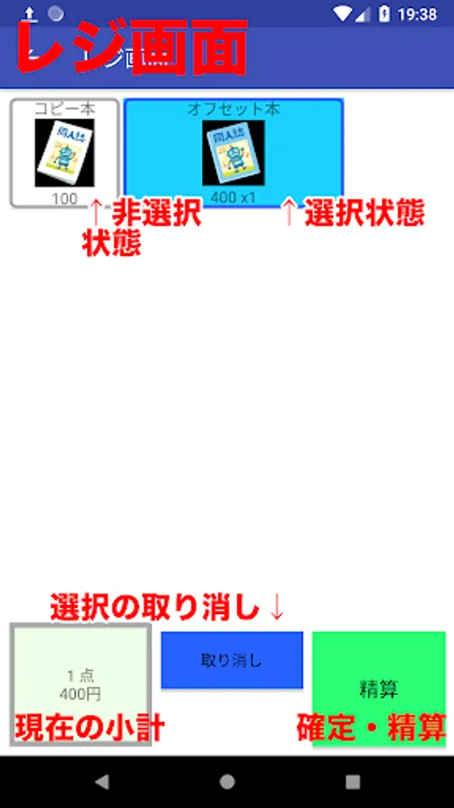 It is a simple regispir of a smart phone terminal-completed type for a small coterie circle. It records the time when distributed items are distributed to whom and what kind of opponent, and features of POS checkout settlement are attached.