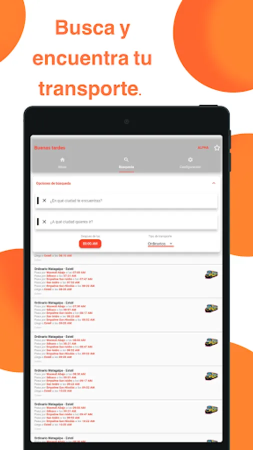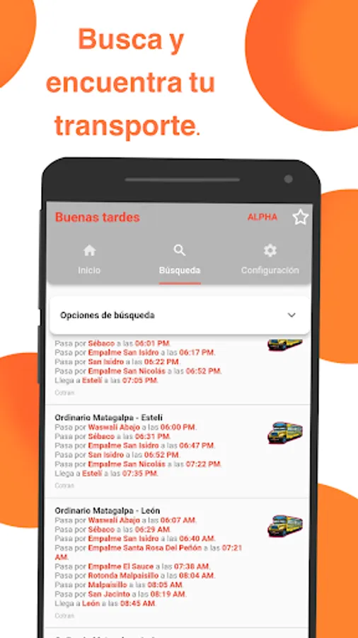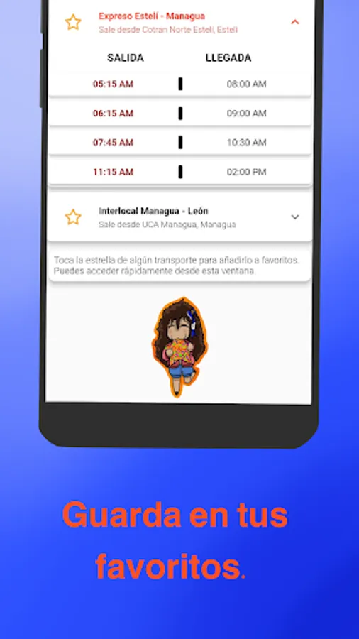Kurabus contains a (small for now) collection of transportation (ordinary, rural, express, interlocal and taxis) in Nicaragua. Each transport contains departure times, information on the departure and destination sites, type, distance; It can also contain the duration of the trip and places where it makes stops to pick up and drop passengers. If the transport has a duration, it shows the approximate time in which it passes through a certain site. The transports are divided by department and municipality, however you can search for a transport that leaves or stops in a certain city heading to another, in addition to selecting the type and displaying results after a selected hour.