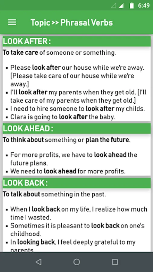 4. Most used Phrasal Verbs like Pick Up, Hang Out, Break Down, Look Forward, Take Off, Take On, Take Over, Get By, Get Across and many more useful Phrasal Verbs.